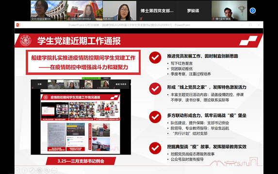 首先,古莉针对近期学院学生党建工作进行了通报。自2月起,学院扎实推进疫情防控期间学生党建工作,在稳步推进党员发展工作的同时,形成“线上党员之家“,多方联动指导支部开展具有特色的主题党日活动,并挖掘典型战”疫“故事,发挥朋辈教育实效。