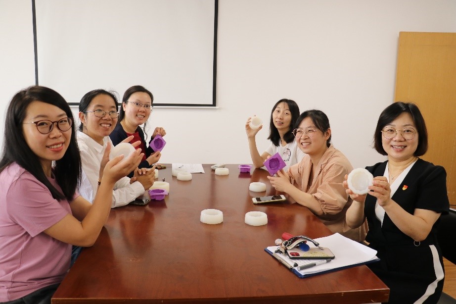 活动邀请了校外老师为大家讲授护肤小常识,并讲解洁面皂制作全过程。授课老师现场指导洁面皂制作全过程。活动气氛热烈轻松,女教职工边学习边实践,精心设计构思,展现了大家心灵手巧的风采。欢声笑语中,一块块独具匠心的精美作品呈现在大家眼前,亲身体验指尖创作带来的喜悦与成就感。