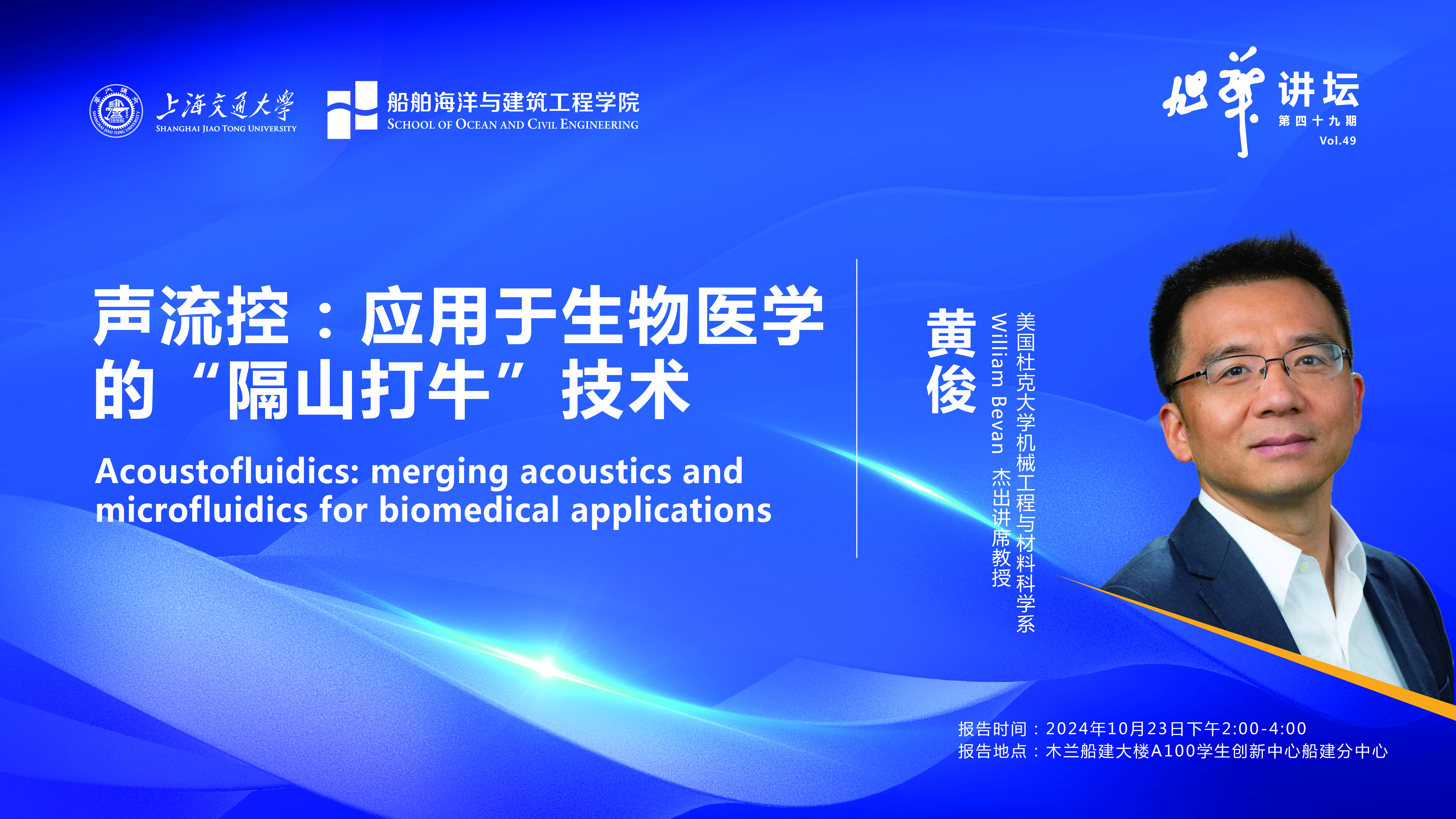 声波在医学中的应用有着悠久而丰富的历史,最早可以追溯到公元前350年,当时被誉为“医学之父”的古希腊医生希波克拉底开发了一种检测肺部积液的方法。他通过摇动患者的肩膀并聆听从胸部发出的声音,奠定了声学诊断的基础。近年来,一种新的生物医学声学技术前沿领域正在兴起,即声流控。该领域融合了声学与流体力学的尖端进展,为癌症早期检测、无创产前健康监测、创伤性脑损伤和神经退行性疾病的诊断,以及改进输血和免疫疗法的治疗方法提供了前所未有的能力。这一技术不需要直接接触目标,就可以“隔山打牛”般地对细胞或更小的生物粒子进行精准地操控。今天我将展示我们实验室在声流控这一激动人心的领域的最新进展。通过多个例子,我将展示声流控在生物医学应用中的多功能性,包括 (1)用声流控来分离外泌体(sEVs)和循环肿瘤细胞,(2) 用声流控来分离病毒,(3)声流控在研究细胞间通讯中的应用,(4)声流控在组织工程中的应用,(5)声流控在早期诊断中的应用,(6)声流控在医学治疗中的应用。这些声流控设备能够精确操控流体和从几纳米到几厘米范围内跨越七个数量级的生物颗粒。凭借其独特的属性——多功能性、精确性和生物相容性——声流控器件在很多生物医学领域中具有巨大的潜力。