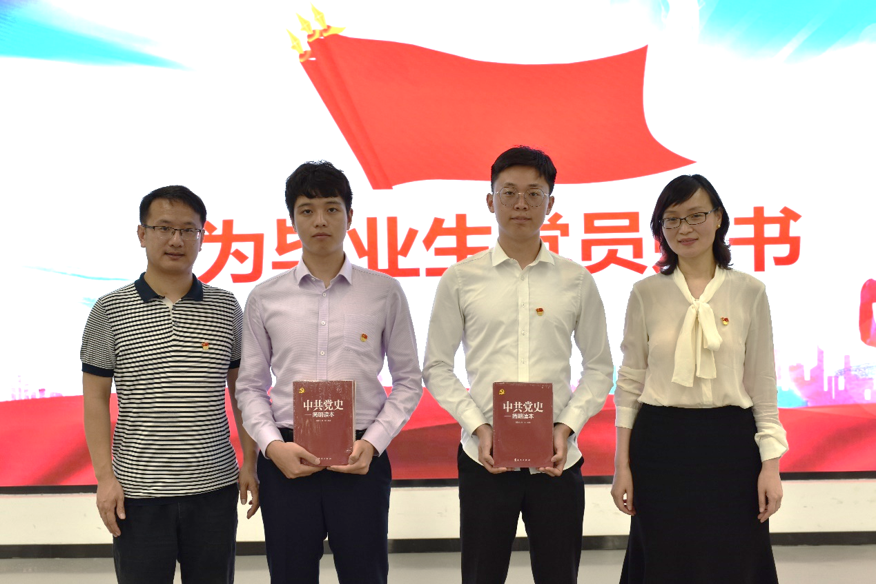 学史明理,学史增信,学史崇德,学史力行,周薇和宋续明为毕业生党员代表赠送了《中共党史简明读本》,希望大家在毕业以后也能继续加强党史学习教育,不忘初心,接续奋斗。
