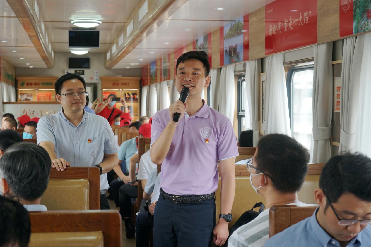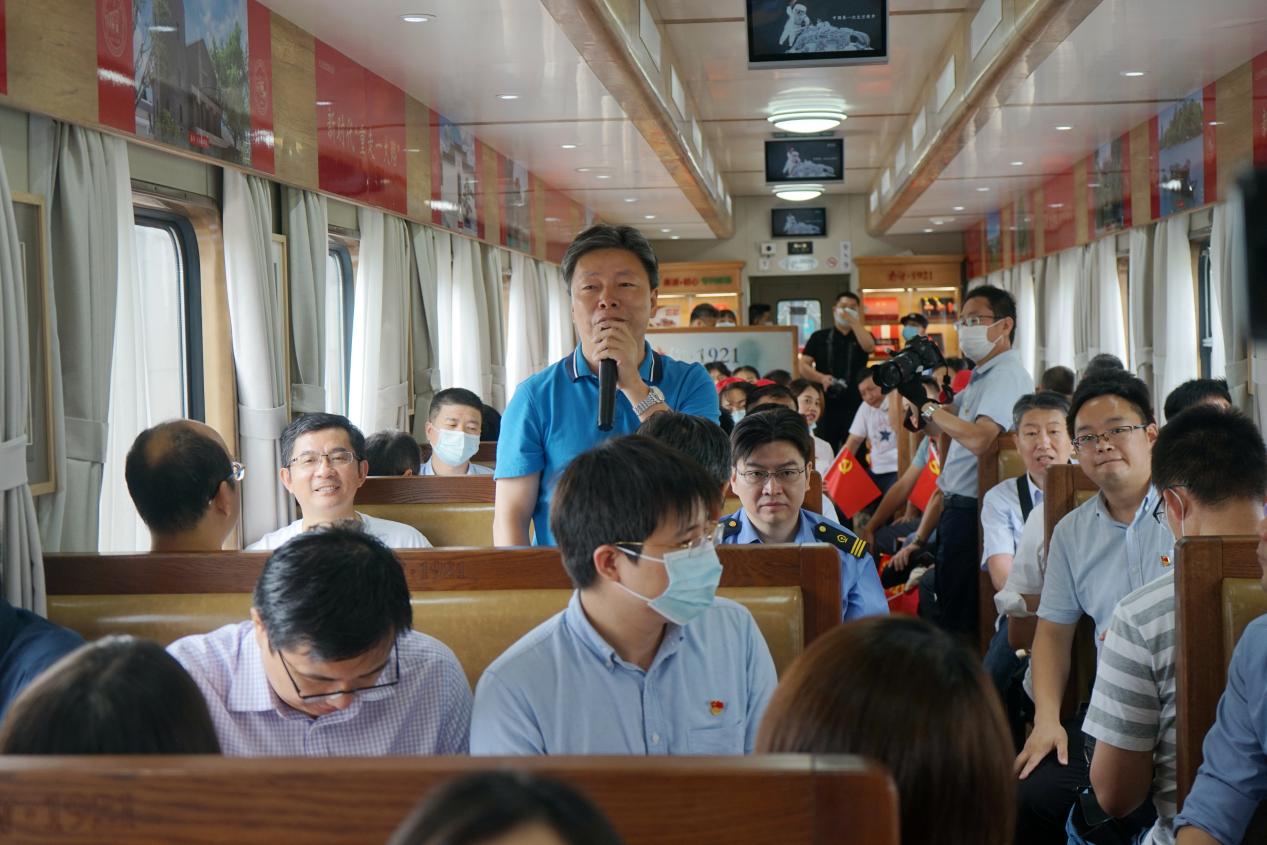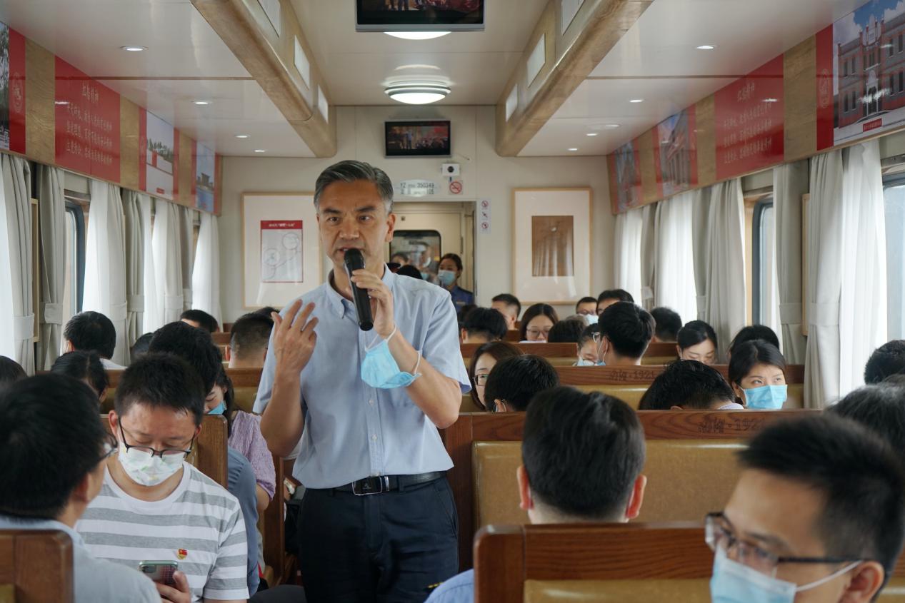 中国铁路上海局党委宣传部部长陈万钧在致辞中表示,上海交大和中国铁路的发展有着深厚的历史渊源,交大是中国铁路事业的见证者、建设者和创造者,几代交大人作出了卓越贡献。陈万钧介绍了“南湖·1921”红色列车的由来、运营情况和社会反响,结合学习习近平总书记七一重要讲话精神,充分肯定了联合主题党日活动的意义。陈万钧还勉励“知行”社会实践团队牢记习近平总书记在七一重要讲话中对青年的教诲,知行合一,不负韶华,不负青春,在新时代建功立业,书写壮丽人生篇章。