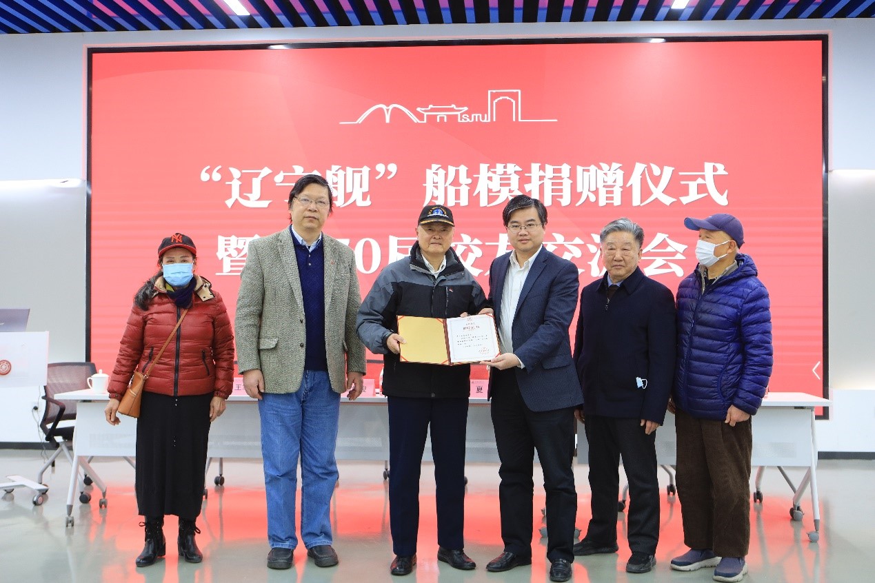 爱国荣校,筑梦深蓝。在各位嘉宾的见证下,廖世俊代表学院接受了夏爽捐赠的“辽宁号”船模,薛鸿祥向夏爽致送了捐赠证书。薛鸿祥表示,“辽宁舰”航母是大国重器的标志性代表,其船模将会放置于院史馆展厅展览,激励全院师生不忘前辈精神,继续砥砺前行。