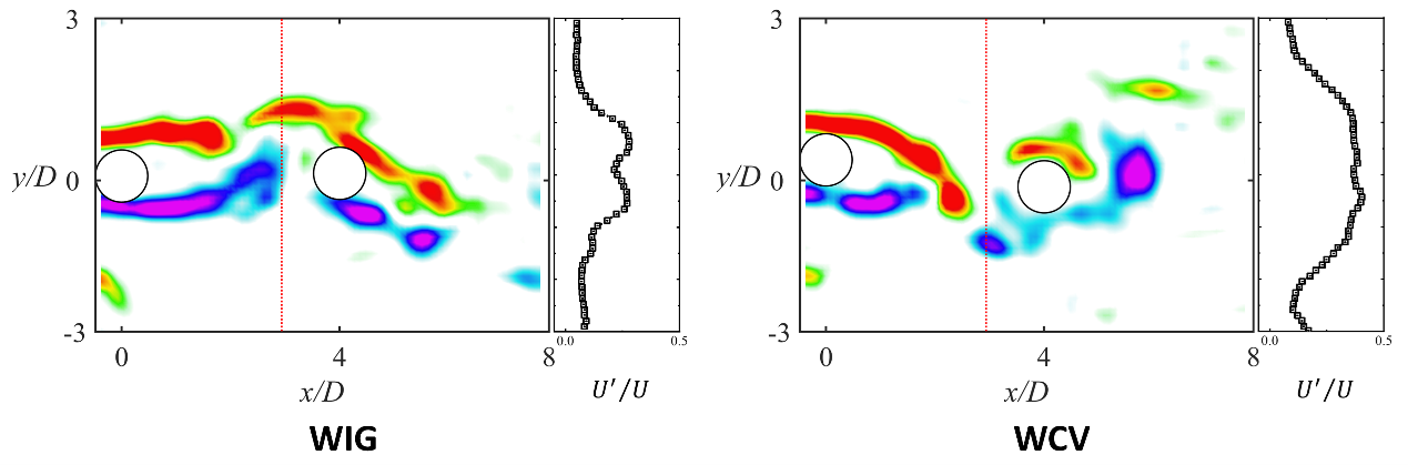 图1 尾流驰振(WIG)与尾流俘振(WCV)位移幅值、频率与流体力特性对比