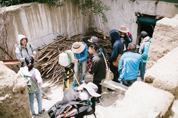 在海拔4020米的江孜地区开展调研,实践团成员需克服高原反应,将在两周的实践中从无损检测、激光扫描、摄影测量、测绘等四个方面有序开展实践活动。江孜老街历史悠久,多数建筑年久失修,而某些古建房间中的壁画是一本本的活历史,记录着当地宗教文化历史,具有较高的研究价值。无损检测组的成员将利用热成像监测仪对壁画的病灶进行分析评估,提出下一步应对保护建议;激光扫描组顶着烈日仔细摄录古城建筑内外立面;摄影测量组操控无人机扫描建筑总体概况;测绘组成员穿梭在矮小局促的房间中认真记录测绘数据。“雪域天珠”实践团的成员们克服建筑年久失修的危险性,怀着一份对建筑历史遗产的敬畏感和文化传承的使命感将自身专业知识融入实践活动中,为古建筑遗产保护献上一己之力。
