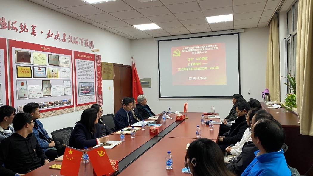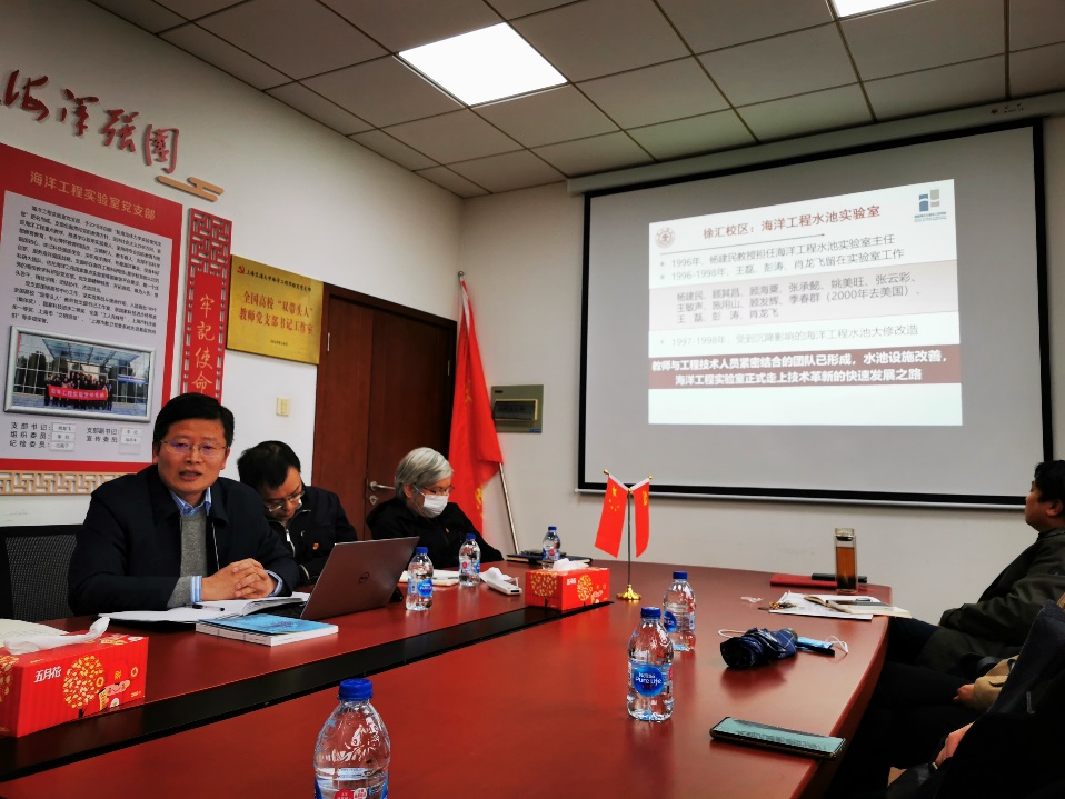 经过前期两周多时间查阅资料、制作课件,肖龙飞精心准备了一堂生动的学“四史”党课:从上海到海上——海洋工程实验室发展历程,在带领师生回顾实验室30年建设发展的过程中,激励党员坚守初心,不断进取。党课内容分为四部分。一是序篇:从无到有上海徐汇校区——船舶性能实验室到海洋工程实验室;二是筑基:从弱到强上海徐汇校区——海洋工程实验室艰难起步与探索;三是跨越:实现一流上海闵行校区——海洋深水试验池建设与应用;四是引领:迈向未来两洋一海——海洋工程实验室向实海域开拓。四个篇章,全面回顾了交大海洋工程实验室发展历程。从徐汇校区最早的船舶性能实验室,在盛振邦、黄祥鹿、顾其昌等老一代交大人不断努力与探索下,建立起我国最早的海洋工程实验室,实现了从船舶工程到海洋工程第一次跨越;在随后的发展中,在杨建民教授的带领下,海洋工程科研大团队洒下辛勤汗水,逐渐积累形成具有国际先进水平的海洋工程试验技术,并为如今我国首座海洋深水试验池建成和投入使用立下了汗马功劳,使实验室成功跻身于世界一流海工实验室,为我国海洋工程自主研发实现从浅海到深海的历史性跨越做出了重大贡献。如今,随着“海洋强国”重大战略的实施,实验室将视野逐步扩展到“两洋一海”,将研究方向开拓至实海领域,从中国南海到中东海域,再到欧洲北海,奋发图强,追求卓越,为加快我国海洋强国建设贡献巨大力量。肖书记回顾过往,十分激动地说到:“回顾海洋工程实验室的发展,所取得的成就离不开每个人的贡献,历经三十载的风风雨雨,我们要牢牢记住先辈的事迹与贡献,记住发展所历经的种种困难险阻,只有铭记历史,才能铸造辉煌。