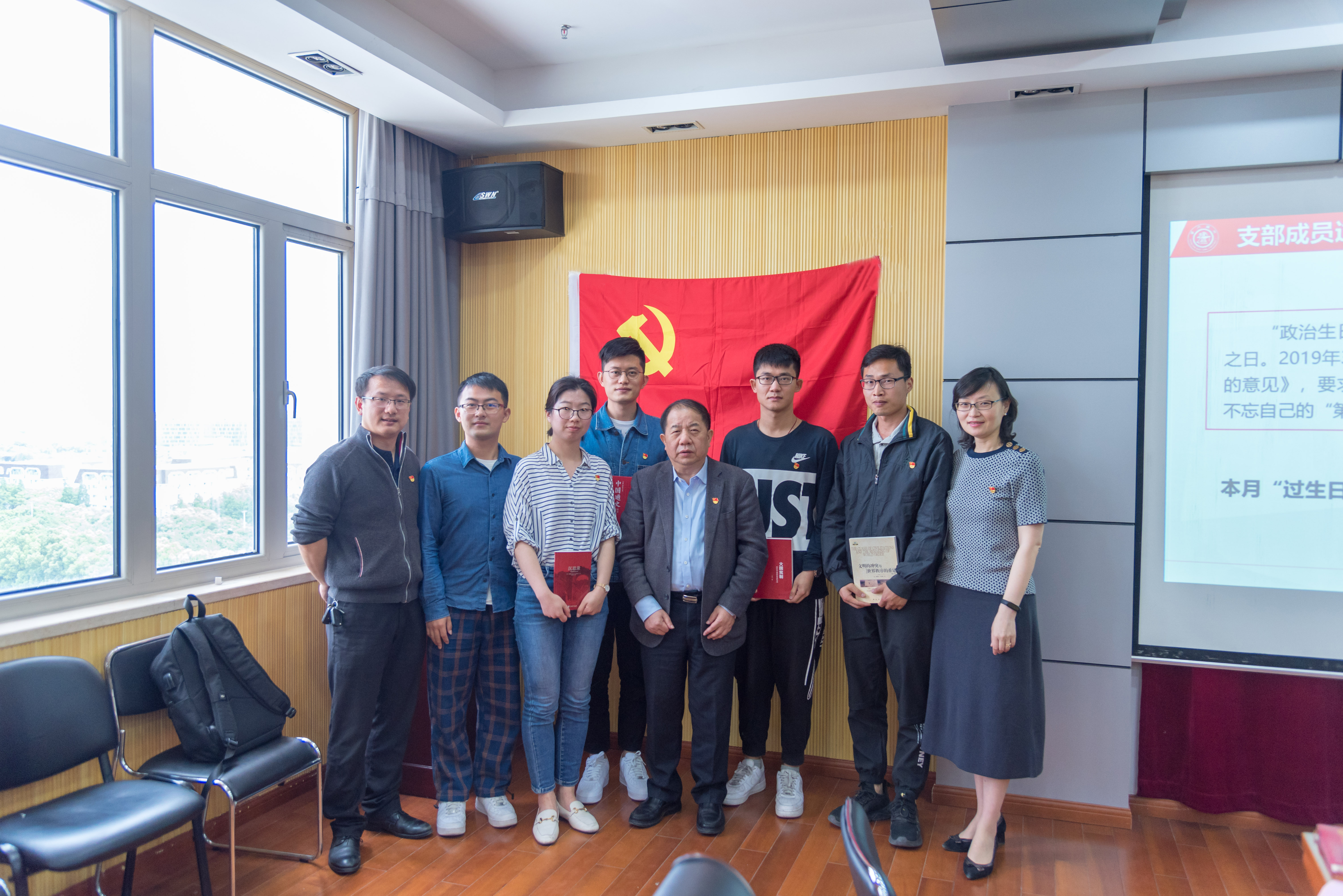 主题党日活动的最后,支部为李旭、吴琪、孙鹏飞、李双等四名5月份入党的同志过集体政治生日。他们分别结合自身经历,分享了自己的入党初心,并且表示要以更加饱满的热情投身到工作中,切实发挥好共产党员的先锋模范作用,向党组织交上一份合格的答卷。林忠钦校长为四位同志赠书留念。全体党员面向鲜红的党旗,坚定地举起右拳,在党支部副书记孙鹏飞同志的带领下,重温入党誓词,牢记为共产主义奋斗终身的决心和信念。