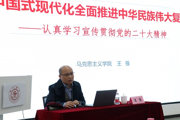 王强教授为大家深入浅出地解读了二十大报告的主体内容,并着重从百年大变局中国式现代化的推进和拓展、全面建设社会主义现代化国家行动纲领、世界上最大执政党行稳致远的独有难题的三个方面出发,将党的二十大报告与当前国内外形势紧密结合,对党的二十大精神进行了系统讲解。讲座进一步解读了牢牢把握新时代新征程的形势和任务,认识世界之变、如何积极应对挑战、坚定文化自信的意义,深刻把握中国式现代化是全新的现代化,努力走出的一条强国建设、民族复兴的康庄大道。