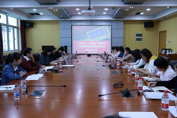2019年11月2日中午 ,按照“不忘初心、牢记使命”主题教育的相关部署,成人漫画 行政党支部在木兰楼A1002会议室开展了对照党章党规找差距专题会议。院党委书记周薇,副书记王喜芳、宋续明,行政组室全体教工参加会议。会议由支部书记袁敏主持。