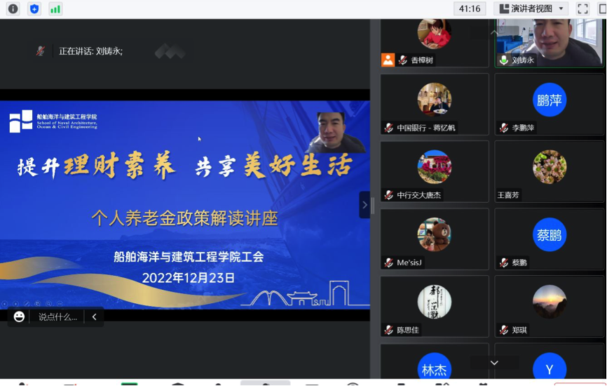 为增加学院教职工对个人养老金最新政策的知晓率,切实把教职工关心的实事办好、好事办实,2022年12月23日中午,成人漫画 工会举办“提升理财素养,共享美好生活”个人养老金政策解读线上讲座。学院党委副书记王喜芳、工会主席刘铸永和50多位教职工参加活动。