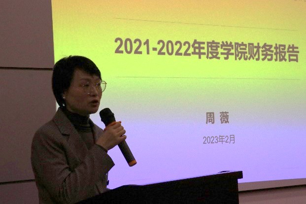 学院党委书记周薇向大会作《成人漫画 财务工作报告》,介绍了2021-2022年学院总体收支情况、预算执行情况和2021-2022年财务重点工作。她表示学院将继续充分发挥财务支撑保障作用,积极筹措资金,合理配置资源,保证重点工作,优化师生服务,确保学院各项事业平稳健康发展。