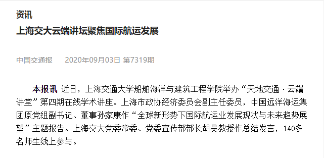 【中国交通报】上海交大云端讲坛聚焦国际航运发展