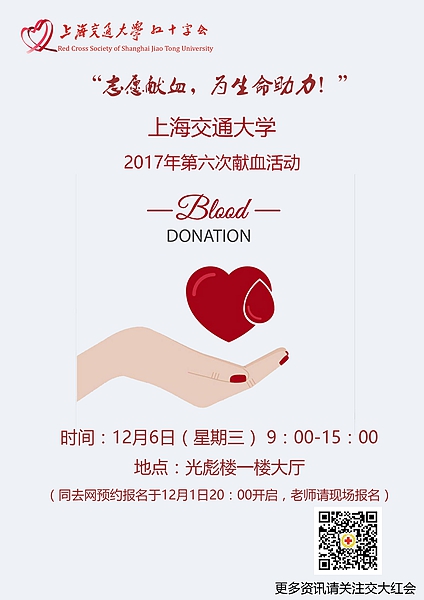 校红十字会将于2017年12月6日组织开展“志愿献血,为生命助力”主题献血活动,号召广大师生践行交大人无私奉献的品质,发扬人道、博爱、奉献的红十字精神。
