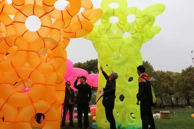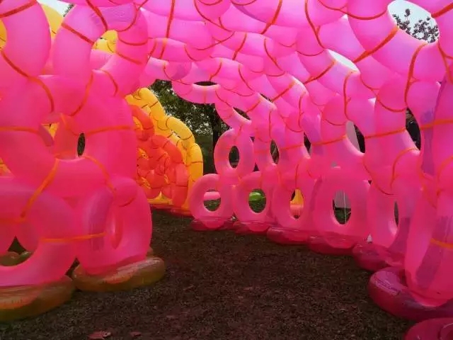 游泳圈组利用扎带把彩色的游泳圈固定在一起完成形态的塑造,构成了体量巨大的直柱和曲面。作品使用了红橙绿三色的游泳圈,半透明的游泳圈过滤了一部分阳光,使空间内不同地区的光影有红橙绿不同的色彩,富有童趣。作品旁还留出一部分游泳圈供校友和小朋友嬉戏,游人也可以继续搭建。同时散落的游泳圈也是极好的座椅,供感到疲惫的游人稍作休息。
