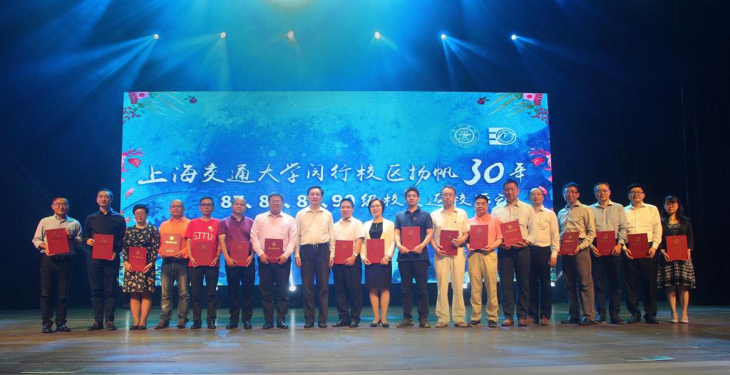 姜斯宪、林忠钦、王宗光、马德秀、谢绳武、张杰、陶爱珠、白同朔、范祖德、潘永华、毛杏云、黄晞建、何永棣、吴旦、纪凯风等校领导和老领导代表共同登台回忆了三十年前的难忘时光,为曾经的同学、如今已成为社会栋梁的校友们送上真挚的祝福。当上课铃再一次响起,全场观众起立向当年的各位老师们致礼问好。 姜斯宪代表学校向资助学生社团的校友、企业代表颁发捐赠证书并讲话。他表示,闵行校区的建设是交大人敢为人先、勇于开拓精神的体现,为交大的发展开拓了更为广阔的空间。当年交大领导集体、老师们和“首四届”校友作为闵行校区的开拓者,用自己的努力为交大和闵行校区的发展做出了重要贡献。此次校友众筹捐赠,是校友们认同母校发展,饮水思源助力母校成长的义举,学校将把各位校友的关爱认真灌注到各项工作之中,在建设世界一流大学的道路上砥砺奋进,铿锵前行。晚会还宣读了“闵行校区扬帆30年”校友众筹项目结果,所筹资金将用于校园雕塑创作和资助学生社团,促进交大校园文化发展。