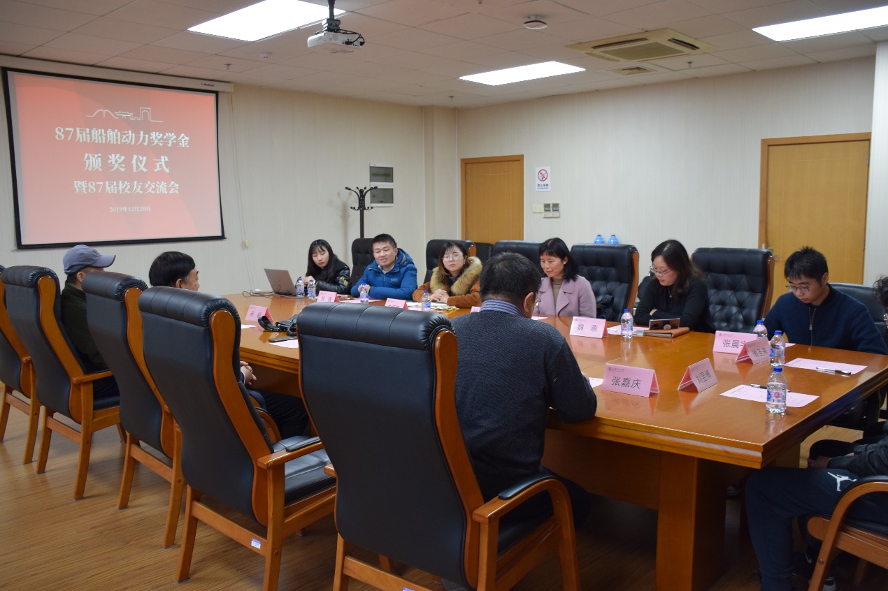 12月20日下午,成人漫画 87届20131船舶动力奖学金颁奖仪式在木兰船建大楼A1008会议室举行。87届校友牟广文学长,郝毅学长,张翠熙学姐,乐国杰学长,张嘉庆学长,成人漫画 党委副书记宋续明,船舶与海洋工程系副系主任陈俐,校友工作联系人魏燕,学生事务负责人史舒婧,船建学工办辅导员邹碧铖,2019年度船舶动力奖学金4位获奖学生出席仪式。