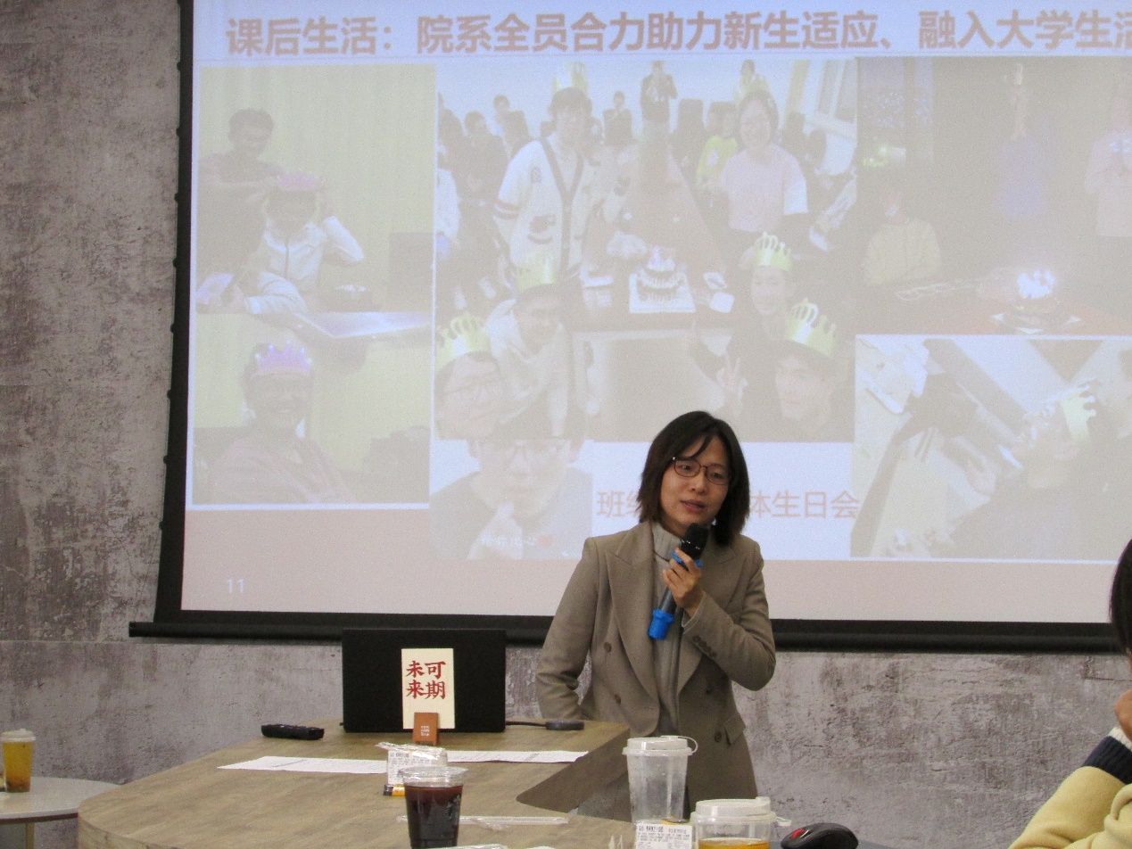 周洁介绍数学学院本科生导师和本科生班主任在指导和支持学生过程中的主要做法。她指出,可以通过开读书会、分享学习等方式加强师生互动沟通,引导学生形成良好的学习习惯,帮助学生树立正确的价值观和人生观。
