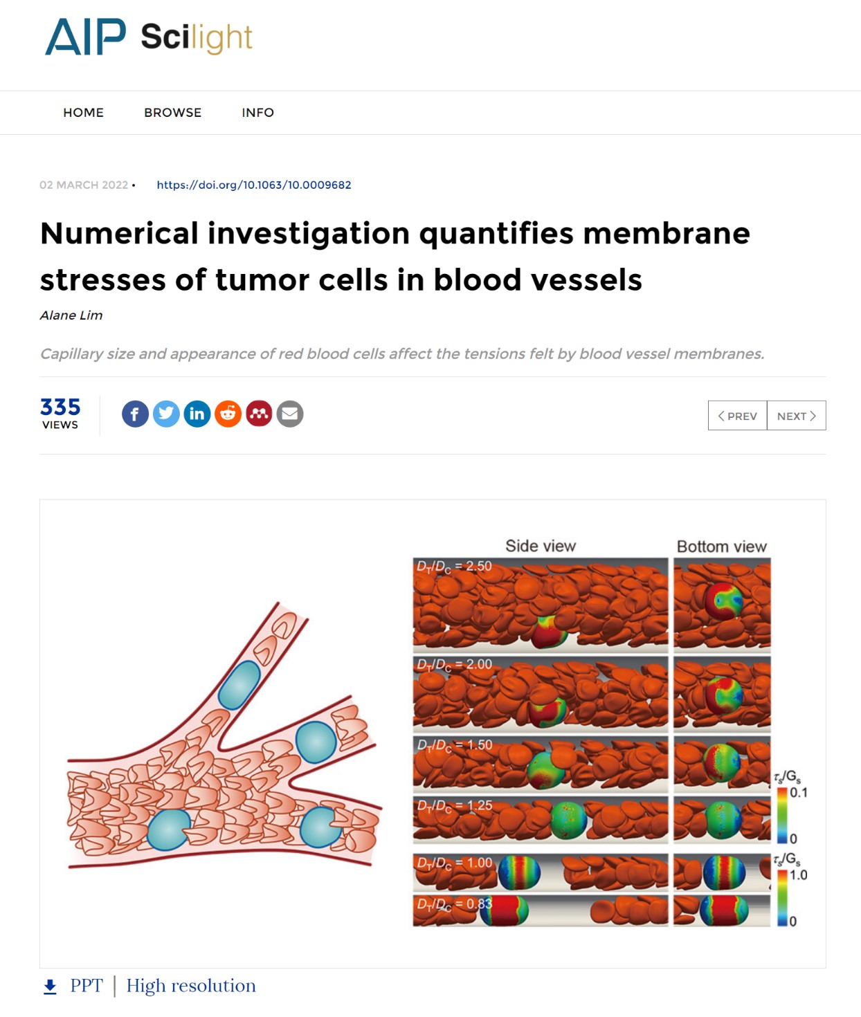 美国物理学会AIP Scilight专访了本文的通讯作者龚晓波教授,并以“Numerical investigation quantifies membrane stresses of tumor cells in blood vessels”为题对研究工作进行了报道。该项工作的完成人包括:成人漫画 的景鹏博士生、王骁龙博士后、龚晓波教授以及东京都市大学的Satoshi Ii博士,日本大阪大学的Kazuyasu Sugiyama教授和日本理化研究所的Shigeho Noda教授。成人漫画 为第一作者单位和唯一通讯作者单位。