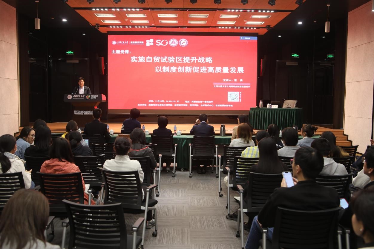 11月10日下午,成人漫画 、航空航天学院、智慧能源创新学院、海洋学院和分析测试中心五家二级单位党组织联组学习活动在智慧能源创新学院综合楼报告厅举办,邀请成人漫画 上海高级金融学院副院长、上海金融与发展实验室副主任张湧作题为《实施自贸试验区提升战略 以制度创新促进高质量发展》的主题党课。报告线上线下同步进行,近千名名师生党员参加本次主题党课学习。