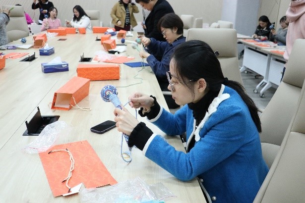 此次养生锤制作材料主要有民族手工布和养生中草药,制作工序包括倒药材、缠棉线、打绳结等,能锤打经络,能舒缓疲劳,起到养生保健的功效。大家跟随手工老师,从民族手工布中,挑选棉麻布,展开平铺,填放草药,用力按压,绑扎成圆,打结绑紧,一个个朴素典雅、药香扑鼻的实用养生锤制作完成。