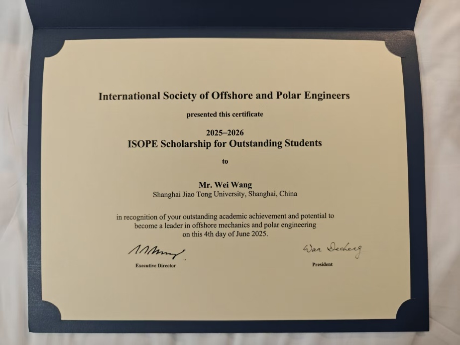 近日,第35届 International Ocean and Polar Engineering Conference(ISOPE)国际会议在韩国高阳市举行。会议颁发了 2025 ISOPE Scholarship for Outstanding Students 奖项,以表彰全球范围内在海洋与极地工程研究中表现卓越的青年学者。成人漫画 博士研究生王卫获此殊荣,成为本年度三位全球获奖者之一。
