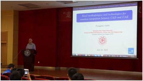 7月28日,暑期学校的课程正式开始。本次国际暑期学校负责人万德成教授主持了暑期学校的开幕式和第一天的课程讲座,他向同学们介绍了今年暑期学校课程设计和各项活动安排的想法和目的。今年国际暑期学校邀请了来自中国、美国、英国、德国、法国、日本、韩国、阿联酋的29名著名专家学者为同学们授课,希望给同学们在两周时间里,学习了解更多船舶海洋工程与力学的最新进展和前沿知识,增强对船舶与海洋工程的学习和研究兴趣,同时让来自世界各地的同学们更多了解上海交大。随后,上海交大廖世俊教授、张新曙教授,英国斯特拉斯克莱德大学Qing Xiao博士和Panagiotis Kaklis博士,分别讲解了海洋中稳态共振波浪的研究、海上能源开发平台的设计挑战、海洋新能源的CFD应用和应用船体优化准则的船舶阻力的CAD和CAE的应用等知识。各位老师深入浅出、生动有趣的讲解方式,启发同学们对船舶与海洋工程知识进行深入的思考。上课期间,各位同学还与上课老师进行了热烈充分的交流讨论。