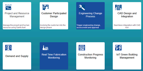 该平台基于云平台的现代化、信息化管理理念,通过开放式的架构及强大的数据接口兼容目前市场上主流的ERP、BIM和项目管理软件工具,并能为用户提供定制化的功能模块服务。该平台支持从方案阶段至运营阶段的全过程管理,提供包括投资规划、市场调研、前期客户参与设计、工程设计、生产物流、建造安装和运营维护等功能模块,通过文档图纸管理、生产控制、物流规划、施工安装管理、维护监测等功能的集成,为业主方、设计方、制造方、物流方、施工方、监理方、运维方及政府机构等在内的所有参与单位提供协同工作的平台,做到建筑全生命周期的信息管理,真正实现设计标准化、生产工业化、施工机械化以及管理现代化。