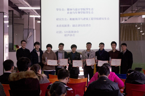 在此次“四自组织”评选展示过程中,成人漫画 研究生会为评选做了扎实而充分的准备。“彩虹周”系列活动中,研会积极组织了各类活动与互动游戏,并以美食感谢参与的同学;复评答辩中,研会主席王宏伟对研会一年来的工作做了精彩的汇报,并为未来工作制定了详细规划;风采展示环节,研会为在场观众奉献了女声小合唱《梦田》、吉他弹唱《那些年》、歌舞汇《青花瓷》三个相辅相成的节目,博得阵阵掌声。凭借精彩的展示,船建研会在终评中一路领先,最终将“四自组织”评选研究生会组唯一的金奖收入囊中。