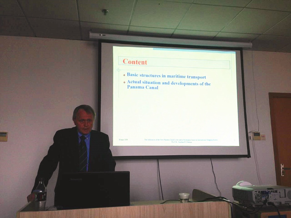 在随后的讲座中,Daduna 教授首先阐释了讲座主题 “The influences of the new Panama Canal locks and a Nicaragua Canal on international shipping routes- Economical and ecological aspects”的背景和意义。接着介绍了世界航运现状,通过分析航运发展趋势,提出了巴拿马运河在世界海运中的重要位置。以此为切入点,Daduna 教授对比分析了尼加拉瓜运河项目的前景,指出了该运河项目的优势和劣势,叙述了自己对于该运河项目的深刻见解。
