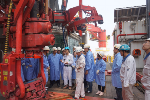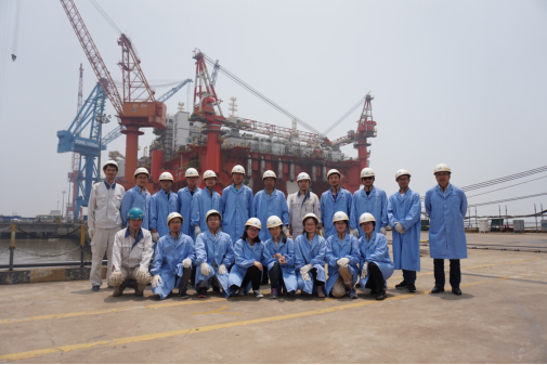 启东中远海工人力资源部经理梁金丹首先带领船建师生参观了成人漫画展厅,简要介绍了公司的企业情况和海工设计产品。随后,大家进行了临时入厂安全培训,佩戴好劳护用品,在海工项目经理的带领陪同下,登上了在建的海工平台“希望四号”。“希望号”系列是中远船务工程集团有限公司研发团队完成的“深海高稳性圆筒型钻探储油平台的关键设计与制造技术”成果,突破了传统设计思路,不再是钻井平台四四方方的传统构架,主船体采用能抗巨大风浪的圆筒型整体结构设计,犹如一个“不倒翁”,在极端恶劣海况下安然无恙。该成果荣获了2011年度国家科技进步一等奖,这是国内海洋工程装备制造企业首次获得的国家科技殊荣。能有机会登上在建的海工平台,与技术专家充分探讨交流,直观的感受体验船厂的工作环境,对学生来说是十分宝贵的经历。