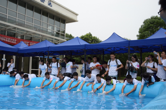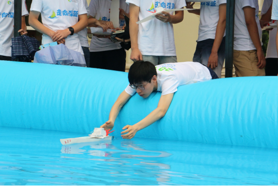 同学们在学长的指导下展开船模“大作战”。经过一天的学习、分组讨论和制作,“走向深蓝”航行器竞速比赛在7月14日下午举行。同学们发挥奇思妙想,制作出的船模都兼具响亮的名字、精致的外观以及风一般的速度。通过比赛的积累、探索和实践,同学们感受到交大为学生创造的科技创新的氛围、精益求精的科研精神。