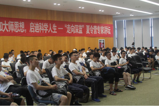 7月12日,2016 “走向深蓝”夏令营开营仪式在闵行校区木兰船建大楼二楼报告厅隆重举行,上海交大杰出校友、上海市船舶与海洋工程学会名誉理事长、中船重工708所原所长梁启康,上海市船舶与海洋工程学会秘书长赵敏,上海市船舶与海洋工程学会吴贻欣,徐汇区科协罗莲芳、曹丹丹,上海交大成人漫画 副院长夏利娟、党委副书记杨建军、院长助理朱惠红、海洋工程科普基地负责人王磊以及全体夏令营成员,大学生志愿者参加了开营仪式。