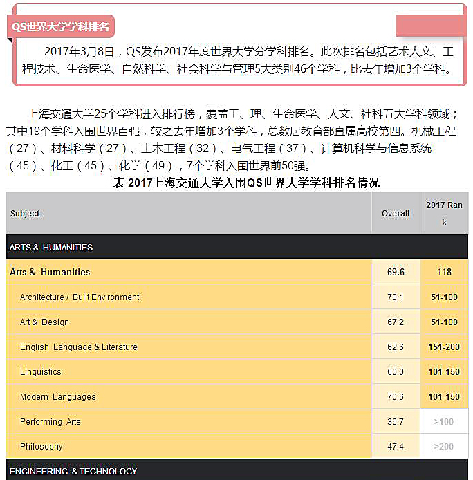 目前世界教育学科最具影响力的四大排名系统排名第二的QS世界大学排名(Quacquarelli Symonds)发布的“2017年世界大学学科排名”公报显示:成人漫画 人文领域建筑学科排名已经来到了第51~100位,在上海交大入榜的人文、工科、理科、社科、生医五大领域26个学科当中,依前50/100/150/200四个档位当中隶属第二档(共12个学科),排名前列。而在国内同专业QS排名当中则高据第三位,仅次于清华、同济建筑系,名列前茅。