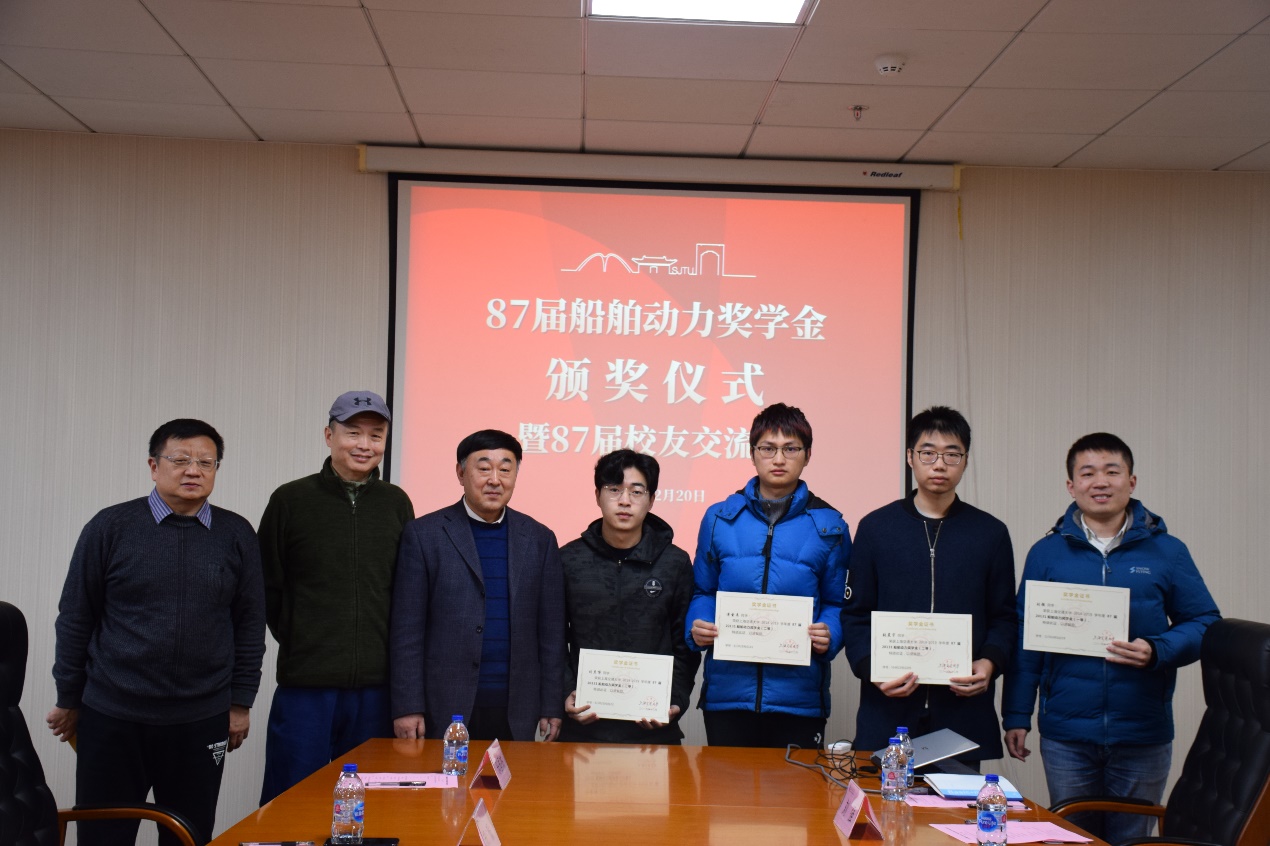 12月20日下午,成人漫画 87届20131船舶动力奖学金颁奖仪式在木兰船建大楼A1008会议室举行。87届校友牟广文学长,郝毅学长,张翠熙学姐,乐国杰学长,张嘉庆学长,成人漫画 党委副书记宋续明,船舶与海洋工程系副系主任陈俐,校友工作联系人魏燕,学生事务负责人史舒婧,船建学工办辅导员邹碧铖,2019年度船舶动力奖学金4位获奖学生出席仪式。