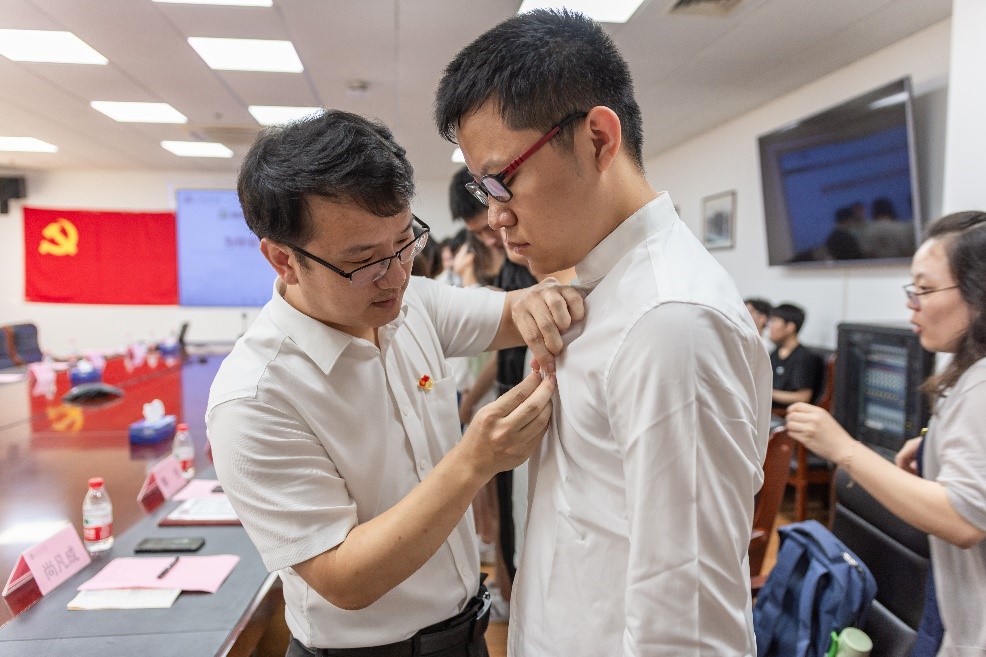 学院老师为各位党员毕业生佩戴党徽并赠书《这就是中国》,全体成员一起重温了入党誓词,提醒各位党员毕业生无论将来去往何地,都要不忘党员职责,矢志不渝地坚守党的信仰,始终如一地努力发挥自身力量为国家和人民作出贡献。