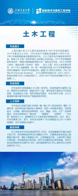 土木工程专业历史悠久,早在1907年学校就设立了铁道科,成为我国历史上最早设立土木工程专业的院校之一。交大土木工程学科人才辈出,校友包括茅以升、张光斗、孙均、刘建航院士等著名学者。1952年院系调整并入同济大学,1985年恢复。